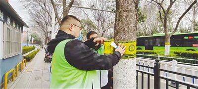 3月8日,市城市管理局园林绿化养护中心组织工作人员给市区主要道路上易发生草履蚧虫害的树木缠绕防虫胶带。