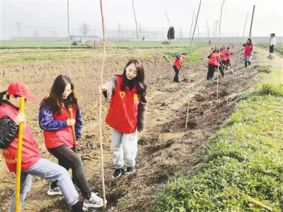 3月9日,在召陵区召陵镇后油李村,120名青年志愿者参加义务植树活动,共种植700余棵无絮杨和楝树。 刘松涛 摄