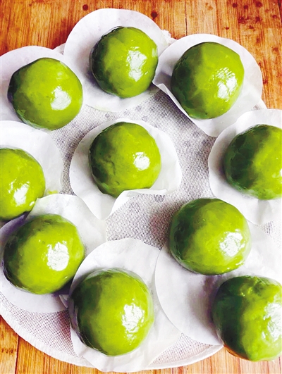春天,乡野间会长出一丛丛嫩绿的艾草。艾草不仅是中草药,还可用来制作一款网红甜点,那就是香糯可口的青团。3月17日上午,记者来到市区辽河路辽河花园小区的魏女士家,看她如何制作这道甜点。 “把艾草汁拌进无筋面粉里做皮儿,再包裹上豆沙馅儿制成青团。绿色松软的皮儿看起来好看,吃起来不甜不腻,满是春天的味道。”魏女士说,每年她都会做很多青团分送给亲友。 首先将采摘来的新鲜艾草去除老根,取嫩叶洗净,然后放入锅中焯水,焯好的艾叶捞出,迅速放进冷开水中冷却,接着控水放入料理机内打成泥。为了保留艾草泥的颜色,可在料理机内放入小苏打。 然后就是和面了。先在无筋面粉里倒入少量开水拌匀,“可以戴上一次性手套,一定要揉匀,不能有颗粒。”魏女士提醒道。 接着,在糯米粉中加糖拌匀,倒入热水,搅拌成絮状,将拌好的无筋面粉和糯米粉混合加入猪油揉匀,放入大碗中,上笼蒸15~20分钟。 蒸好后晾凉,将打好的艾草泥加入。“艾草泥完全揉进面团里需要一点儿时间,揉好的青团皮儿放入保鲜袋备用。”魏女士说。 下面准备馅儿料。将肉松加沙拉酱和蛋黄碎拌匀,分成10份;将提前备好的豆沙也分成10份,每个豆沙里面包上蛋黄肉松馅儿备用。 将青团皮儿也分成10份,取一个青团皮儿揉圆按扁,捏成四周薄、中间厚的形状,放入刚才包好的豆沙蛋黄馅儿,捏紧搓圆即可。 “上火蒸15分钟即可。如果没有艾草,也可以用茼蒿、菠菜等青菜代替。”魏女士说。
