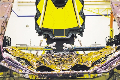技术人员正在对韦伯太空望远镜的一个组件进行检查。