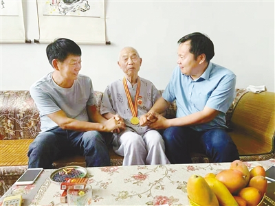 姜魁兴(中)和华店村支书华中民(左)和漯河日报社驻华店村第一书记李永辉亲切交谈。姜晓亚 摄