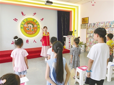 7月16日,市图书馆主办的“七彩童年”暑期公益课堂在市区多个活动点举行。这些公益课堂包括演讲、绘画、围棋等。图为市图书馆新时期文化实践员刘雅锦给孩子们上培训课。