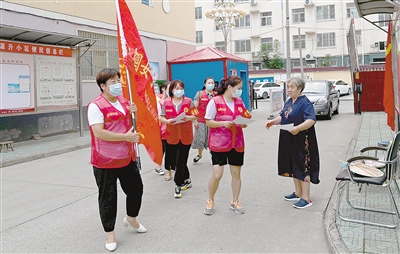 八月十七日,郾城区龙塔街道巾帼志愿服务队向群众宣传疫情防控知识。