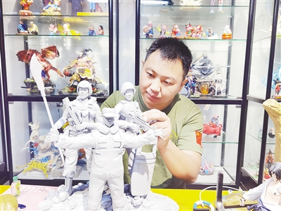 近年来,他把生意交给了妻子,将全部时间和精力都投入泥塑创作中。2019年,丁大军在源汇区河上街景区设立了泥塑工作室,专门从事泥塑的创作、传承和发展。8月20日,记者来到他的工作室时,仿佛进入了一个泥塑作品展览馆:活灵活现的孙悟空、勇猛憨直的张飞、英雄联盟游戏里面的盲僧……桌子上、展架上甚至地面都摆满了大大小小、神态各异的精美泥塑。