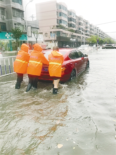 8月22日,市城管局环卫服务中心派人值守泰山路与民主路交叉口,救援陷入积水中的车辆。本报记者 孙 震 摄