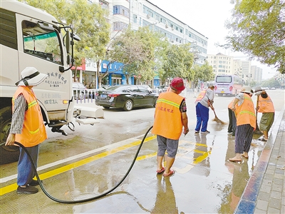 8月22日11时至23日6时,我市出现一次强降雨过程,导致部分道路出现淤泥。为保障市民安全出行,8月23日,市城市管理局环卫服务中心组织工作人员对道路上的淤泥进行清理。图为工作人员在泰山路与人民路交叉口清理淤泥。