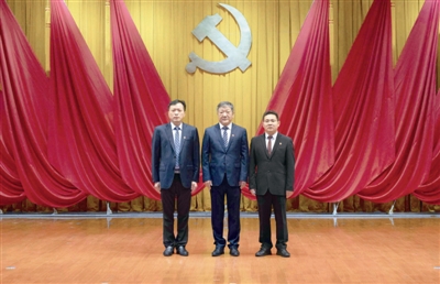 新当选的中国共产党漯河市源汇区第十五届委员会书记王继周(中),副书记史一鸣(右)、刘剑(左)。