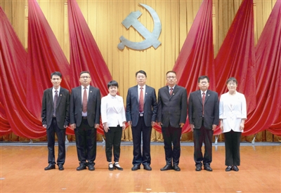 新当选的中国共产党漯河市源汇区第十五届纪律检查委员会常务委员会委员许绍伟(左四)、吕俊豪(右三)、刘琳琳(左三)、闫森(右二)、刘锋(左二)、胡晗(右一)、魏伟(左一)。