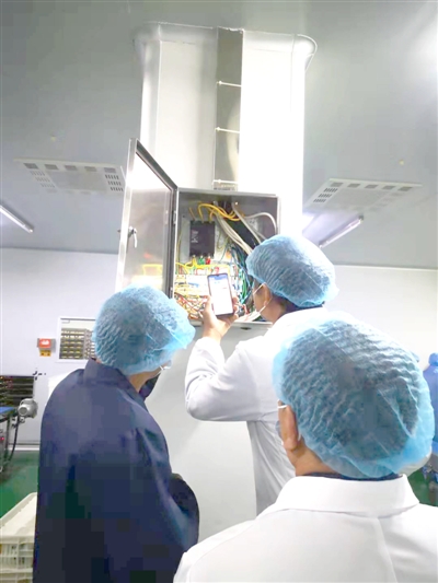 10月29日上午,在漯河慕斯蓝卡食品有限公司,电力专家魏跃华正在生产区配电室边检查边作记录。