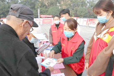 10月29日上午,在临颍县颍川广场,身穿红色马甲的普法志愿者们正在向群众宣传平安建设相关知识,为群众答疑解惑。