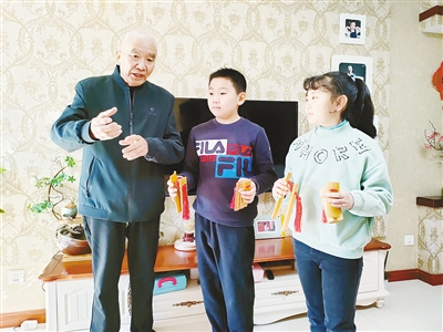 11月14日,记者来到位于嵩山东支路北段一小区的宋清文家中,他正在教邻居家的孩子万铭硕和他的外孙女万忆贝玟学习快板。“昂头挺胸!对,就是这个姿势。”从拿快板的手势到站姿,宋清文一丝不苟地教。10岁的万铭硕告诉记者:“周末有空儿我都会来找宋爷爷学习快板和相声。他有时慈祥和蔼,有时也很严厉。在宋爷爷教导下,我进步很快。”