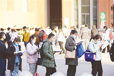 11月28日,在位于合肥市的安徽考区45中橡树湾校区考点,考生在等候进场时复习。 当日,中央机关及其直属机构2022年度考试录用公务员公共科目笔试在全国各考区统一举行。本次招考共有75个部门、23个直属机构参加,计划招录3.12万人。 新华社发