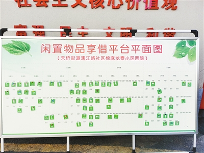 据了解,该小区闲置物品享借平台是今年5月搭建的,旨在增进邻居间了解,拉近邻居间距离,营造更和谐的邻里关系。除了小区门口的平面图,小区还通过微信群对大家分享的闲置物品进行公示,通过赠予志愿者积分等措施鼓励小区居民积极参与。