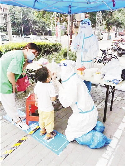 杨艳跪在地上为小朋友进行核酸采样。资料图片