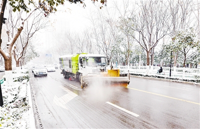 ←1月23日,环卫部门出动大型除雪设备清除市区路面积雪。 本报记者 焦海洋 摄