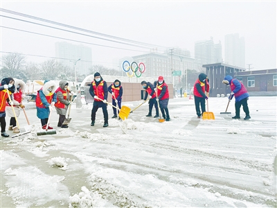 ↑1月23日,市体育局组织干部职工在市体育中心清扫积雪。 本报记者 杨 光 摄