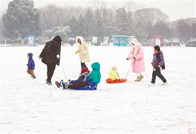 本轮降雪给市民带来不少欢乐,大家纷纷走出家门观雪、游玩。图为1月21日市民在红枫广场滑雪。本报记者 杨 光 摄