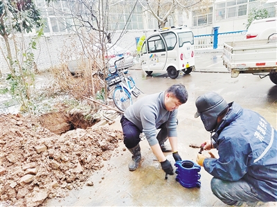 1月21日下午4时许,雨雪交加,漯河清源供水有限公司管网所的维修员在市区大学路广电家属院抢修水管。