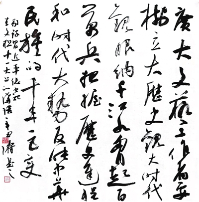 书法(草书)广大文艺工作者要树立大历史观、大时代观,眼纳千江水、胸起百万兵,把握历史进程和时代大势,反映中华民族的千年巨变 钮伟涛 作