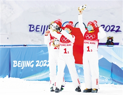 2月10日,中国队选手徐梦桃(中)、贾宗洋与齐广璞(右)在颁发纪念品仪式上。 当日,北京2022年冬奥会自由式滑雪空中技巧混合团体决赛在张家口赛区举行,中国队获得亚军。 新华社记者 费茂华 摄