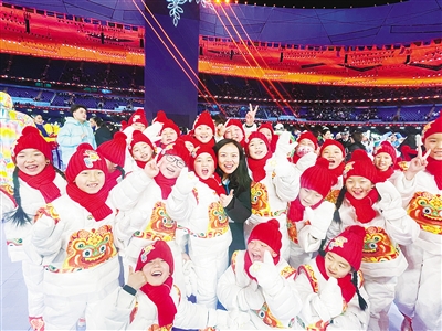 马孟楠在冬奥会开幕式现场跟“马兰花儿童声合唱团”的孩子们合影。