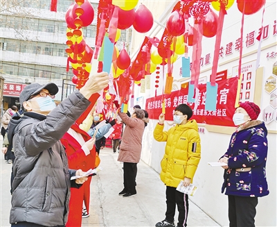 ↑2月10日,源汇区顺河街街道东大街社区组织开展“红色引领幸福密码 党群同心喜迎元宵”活动。活动现场,装饰着灯笼和气球的绳子上悬挂着许多灯谜。社区居民驻足思索,互相讨论,现场一片欢声笑语。