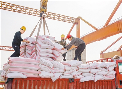 2月9日,位于市城乡一体化示范区的漯河港,各个泊位一派繁忙景象。图为工人们正在忙着卸货。