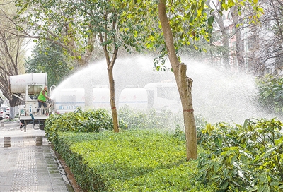 3月7日,在淞江路西段,园林工人正为路边的绿化植物浇水。连日来,市园林部门积极组织开展春季绿化管护专项行动,提升城市绿化景观效果。本报记者 杨 光 摄