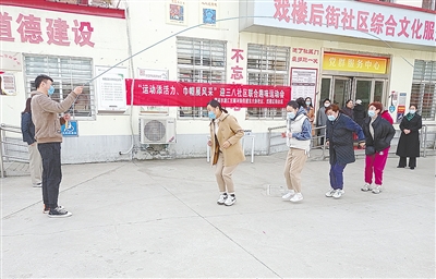 3月7日,源汇区顺河街街道东大街社区和戏楼后街社区联合举办“运动添活力 巾帼展风采”趣味运动会。本报记者 王 培 摄