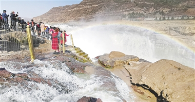 3月8日,游人在陕西壶口瀑布景区游览(手机照片)。 随着气温不断回升,黄河壶口瀑布水流量明显增大,在阳光的照射下,飞瀑与彩虹相映成趣,把一幅动静结合的春天画卷展现在游客眼前。新华社记者 陶 明 摄