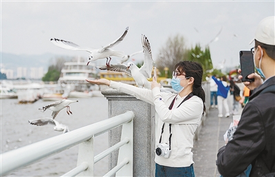 3月16日,游人在昆明海埂大坝观赏、投喂红嘴鸥。 近日,云南省昆明市天气转暖,在春城越冬的红嘴鸥即将启程北往,游人纷纷来到海埂大坝,赏鸥送“友”。