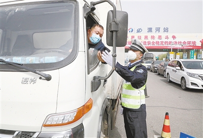 3月16日,在京港澳高速漯河站出口,疫情防控工作人员检查出站车辆司乘人员的健康码和行程码。本报记者 张 佩 摄