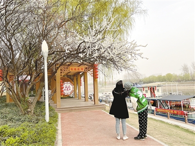 阳春时节,沙澧河风景区内各种花儿竞相绽放。图为3月15日,市民在景区游玩赏花。