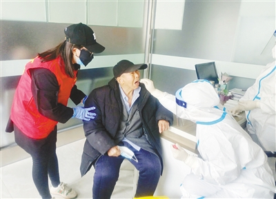 三月二十七日,源汇区马路街街道组织志愿者到源汇区交通路中段颐养园养老公寓,为老人进行核酸采样。