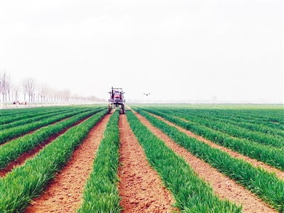 近日,在临颍县高标准农田示范区,工人正在用无人机和自走式打药机为麦田打药。本报记者 刘 丹 摄
