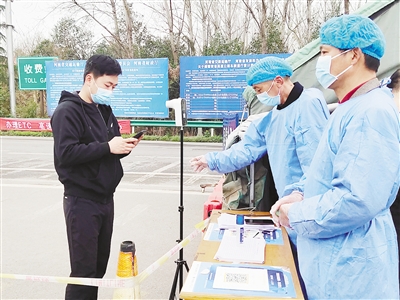 3月31日,在宁洛高速舞阳站,出站司乘人员按照规定在疫情防控卡点扫码、测温、登记。本报记者 刘 丹 摄