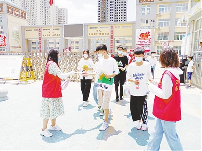 → 6月22日,召陵区委办公室在中招考试许慎中学考点组织志愿者参与“爱心助考”志愿服务,给家长及考生送去扇子、矿泉水和湿巾等防暑降温物品。