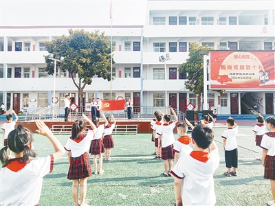 6月20日以来,郾城区东街小学开展“喜迎二十大 童心永向党”主题教育系列活动。图为小学生向党旗敬礼。马威威 摄