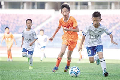 7月10日,在第一届中国青少年足球联赛(浙江赛区)男子小学U11组比赛中,杭州濮家小学的小球员杨皓元(右二)与浙江鸵鸟足球俱乐部的小球员赵奕瑞(右一)拼抢球权。新华社发