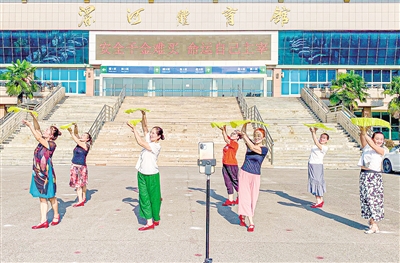 7月8日,在漯河体育馆前的广场上,我市健身秧歌教练员参加2022年河南省老年人健身秧歌线上培训,学习全国第八套健身秧歌。本报记者 杨 光 摄