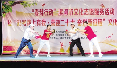 7月8日,市文广旅局主办、市文化馆承办的“春芽行动”漯河市文化志愿服务活动暨“赶考路上有我·喜迎二十大 奋进新征程”文化惠民演出在双汇广场举行。本报记者 焦 靖 摄