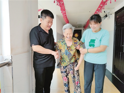 方会军、赵桂华夫妇帮助腿脚不便的老人锻炼身体。