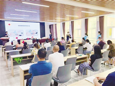 上图: 7月22日,市红十字急救侠应急服务队和龙塔街道社工站在郾城区龙塔街道金牛社区组织开展应急救护技能培训。本报记者 孙 震 摄