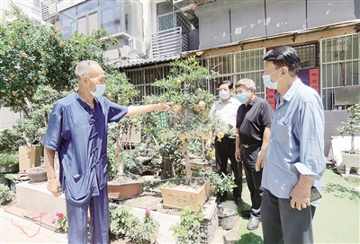 左图: 7月25日,河南省花卉协会盆景分会、河南省中州盆景学会联合郾城区沙北街道为海河小区六个盆景艺术之家授牌。图为授牌后,中州盆景艺术大师张尽善(左)向河南省花卉协会盆景分会、河南省中州盆景学会成员介绍石榴盆景。本报记者 刘净旖 摄