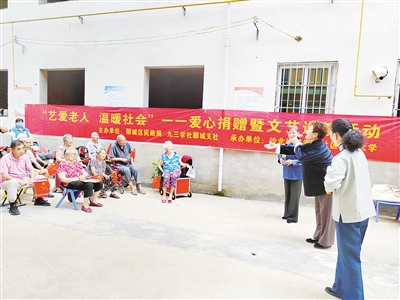 7月25日,郾城区民政局、九三学社郾城支社联合沙北街道海河社区老年大学在金牛社区彩霞养老院举办“艺爱老人 温暖社会”爱心捐赠暨文艺巡演活动。本报记者 张丽霞 摄