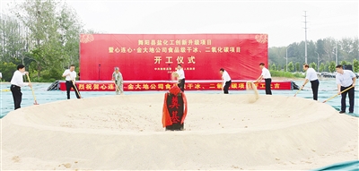 本报讯(见习记者 高雪茵)8月9日,舞阳县盐化工创新升级项目暨食品级干冰、二氧化碳项目开工仪式举行。市委书记刘尚进宣布项目开工并主持召开现场办公会。市长秦保强、河南金大地集团董事长杨玉琛、河南心连心化工集团董事长刘兴旭分别致辞。市领导周新鹤、徐汇川,河南金大地集团总经理汤顺利等参加。