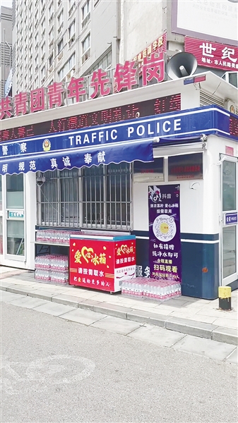 8月8日,一台爱心冰箱出现在市区人民路与交通路交叉口附近(如图)。这是专门为环卫工、快递小哥等户外工作者免费提供矿泉水设立的。