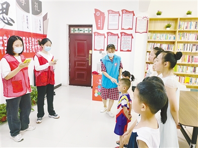 8月9日,孟庙镇社工站邀请洛阳师范学院大学生志愿者在孟庙镇新时代文明实践所开展“乐动心声”活动。图为志愿者教孩子们唱歌。本报记者 孙 震 摄