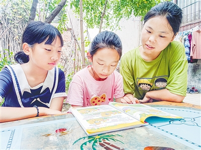 一会儿,邻居家的两个女孩笑着跑来了。她们手中拿着书和作业本,请郭美仪辅导。