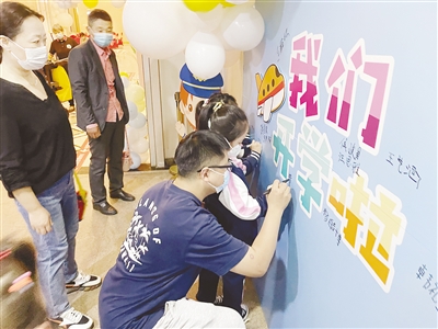 9月1日,市商业幼儿园的孩子们在家长的帮助下在签名板上签名。本报记者 杨 旭 摄